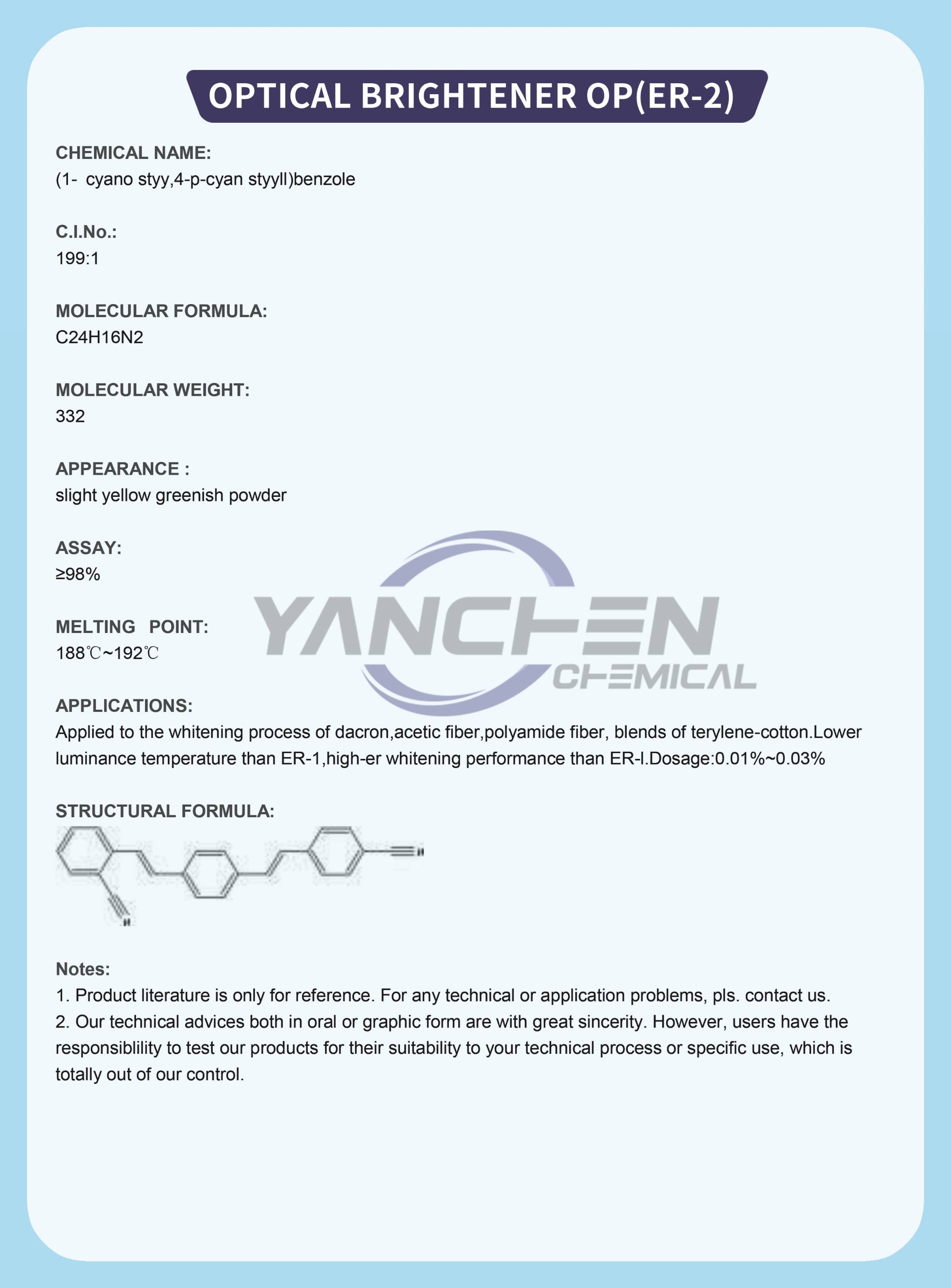 Mainly be used as whitening agent for polyester fiber,as well the raw material of making paste form brightening agent in textile dyeing.